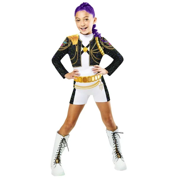 KPOP Demon Hunters. Déguisement de Rumi pour la chanson Golden, version Classic. Taille L. Contenu : un haut et un short, en version imprimée. Age recommandé : 11 ans. Haut avec veste intégrée (non amovible). Matière : 100 % polyester. Nettoyage à l’éponge uniquement. Largeur de la poitrine du produit : 64 cm. Chaussures et perruque non fournies.