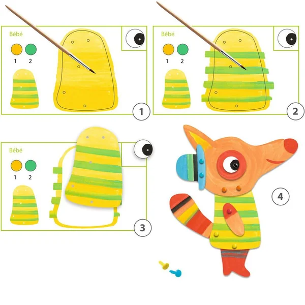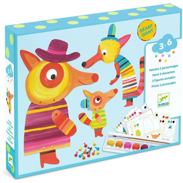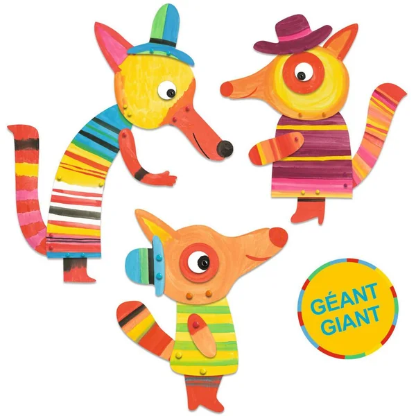 Un coffret de peinture pour décorer et reconstituer la famille renard. Trois grands personnages à mettre en couleur. Après avoir protégé la table avec la nappe, l’enfant peint toutes les pièces avec le pinceau en faisant des traits. Une fois les pièces sèches, il les assemble avec les attaches parisiennes pour reconstituer : le papa renard (50 cm), la maman (40 cm) et le bébé (28 cm) !