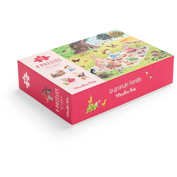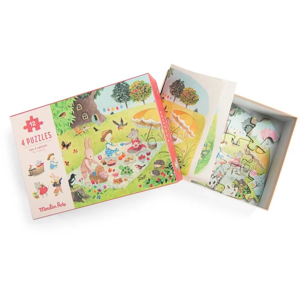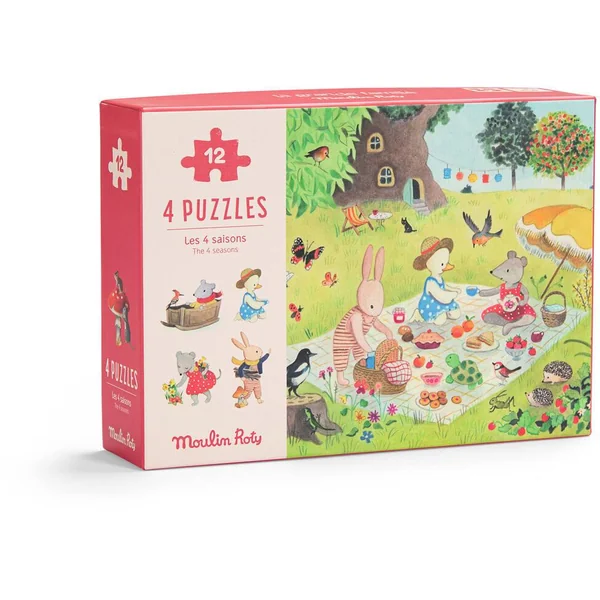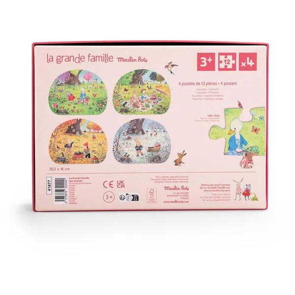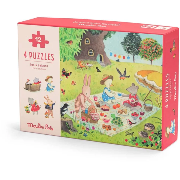 A la découverte des saisons ! Coffret 1er âge contenant 4 mini-puzzles de 12 pièces, aux illustrations de la joyeuse compagnie qu’est La Grande Famile. Chaque puzzle est accompagné d’un poster modèle pour aider les enfants à les recomposer facilement.