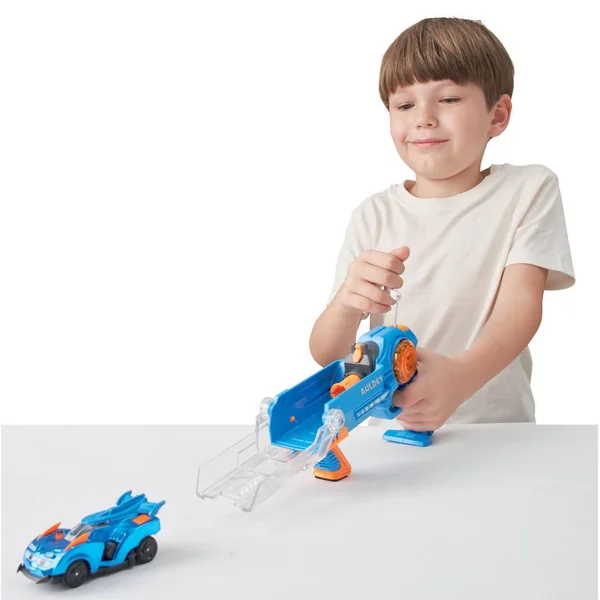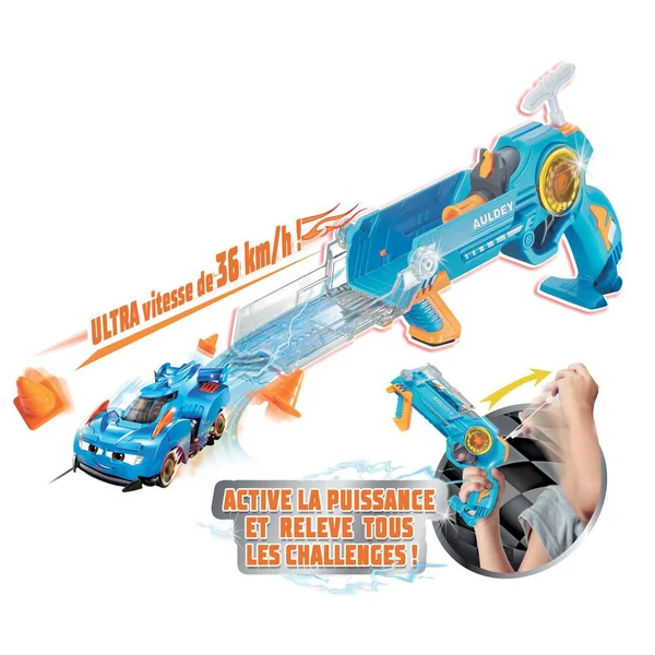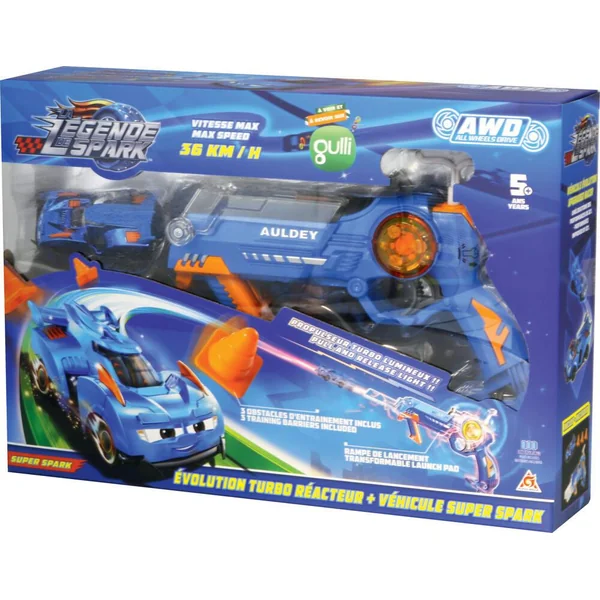 Comme les héros de la série TV La Légende de Spark, diffusée sur Gulli, relève tous les défis pour devenir un Turbo Pilote ! Entraine-toi à devenir le meilleur pilote en évitant les obstacles. Fixe ton véhicule Super Spark au lanceur, actionne la poignée arrière pour accumuler de l’énergie et voir ton lanceur s’allumer. Appuie sur la gâchette : Turbo Tornade, allumage ! Exclusif : lorsque tu appuies sur la gâchette, le lanceur déplie sa rampe de lancement pour propulser ton véhicule avec plus de puissance ! Avec ton lanceur et sa rampe de lancement, atteins 36 km/h pour battre tes adversaires sur la ligne d’arrivée ! Comprend 1 véhicule Super Spark, 1 lanceur Évolution Turbo Réacteur et 3 obstacles d’entraînement. Effets lumineux.