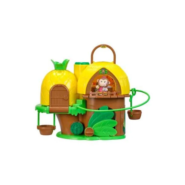 Avec ses différentes pièces (une chambre, une cuisine et une salle de bain), elle offre aux enfants un décor parfait pour inventer des aventures tropicales. Un jouet unique qui propose de multiple activités à découvrir. En appuyant sur le bouton, « POP », l’ananas et la hutte se soulèvent pour laisser apparaitre l’intérieur de la maison. Il y a également une roue à tourner pour choisir les fruits de son cocktail et des rouleaux à faire tourner dans le frigo pour découvrir ce qui se cache à l’intérieur.