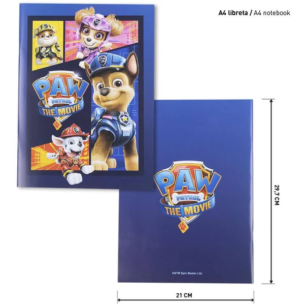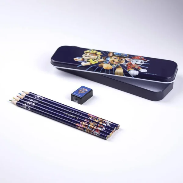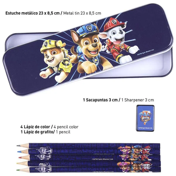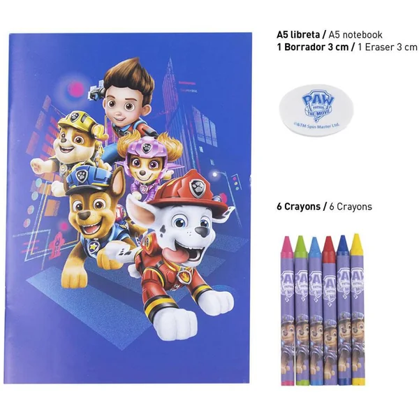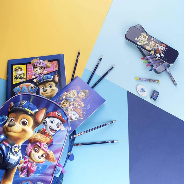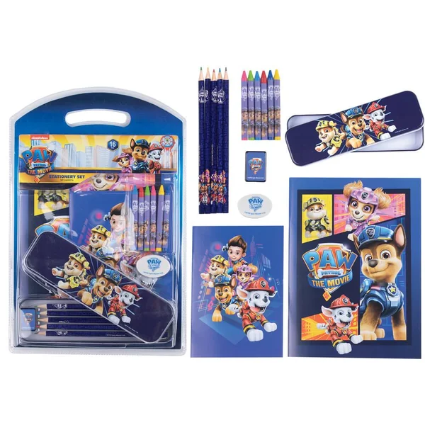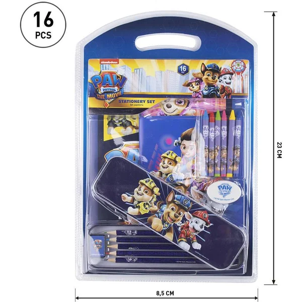 Set de papeterie scolaire aux couleurs de Paw Patrol The Movie. 16 pièces. Contient : 1 carnet A4 (dimensions 21 x 29.7 cm, sans lignes), 1 carnet A5 (sans lignes), 1 gomme, 6 crayons cire, 1 boîte métal (dimensions 23 x 8.5 cm), 1 crayon à papier, 4 crayons de couleur et 1 taille-crayon. Dimensions du set : 23 x 35 x 1.10 cm. Instructions imprimées sur la boîte.