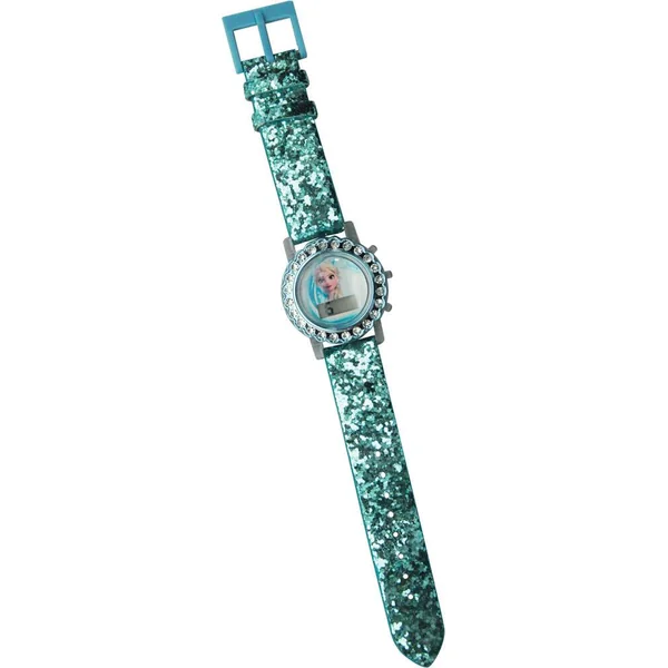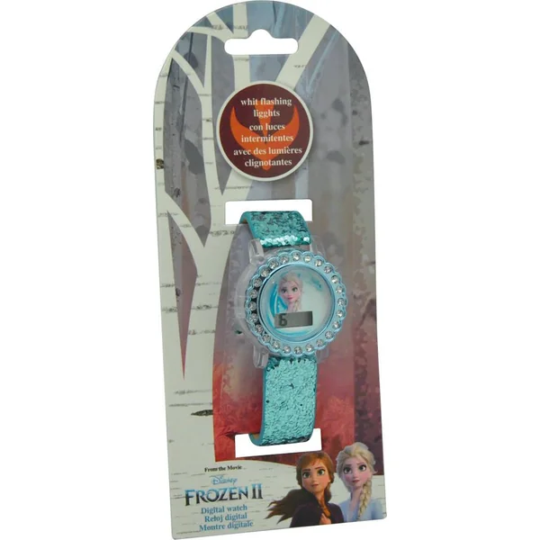 Une montre digitale Frozen 2 avec un joli bracelet en nylon de couleur bleu et de la lumière LED autour du cadran. Pile bouton fournie (LR41). Licence: La Reine des Neiges 2.