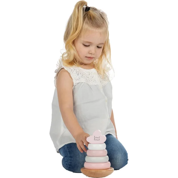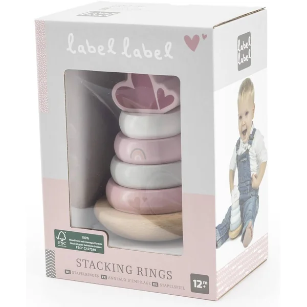 La pyramide à base balançante est faite de bois de hêtre certifié FSC de qualité et a été décorée avec de belles tonalités douces rose/blanc/gris en utilisant de la peinture à base d’eau non nocive pour enfants. Les anneaux d’empilage bleus et le bloc supérieur ont reçu un joli symbole.