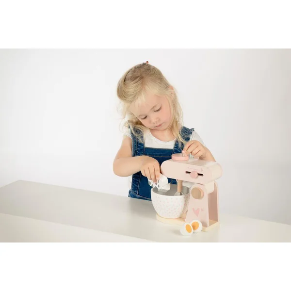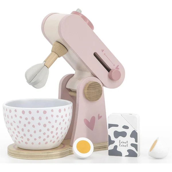Ce robot de cuisine Label Label est exactement ce dont les petits chefs ont besoin pour donner vie à leurs créations imaginaires. Soulevez le mélangeur de sorte que tous les ingrédients peuvent être mis dans le bol à mélanger. Descendez le mixeur et mélangez! En tournant le levier, le fouet mélangera tous les ingrédients. Le curseur peut être utilisé pour régler la vitesse de mélange. Le plaisir de cuisson est assuré! L’ensemble est complété par les accessoires: un œuf à ouvrir et bien sûr une briquette de lait à ajouter à la pâte.
