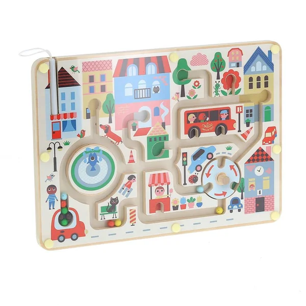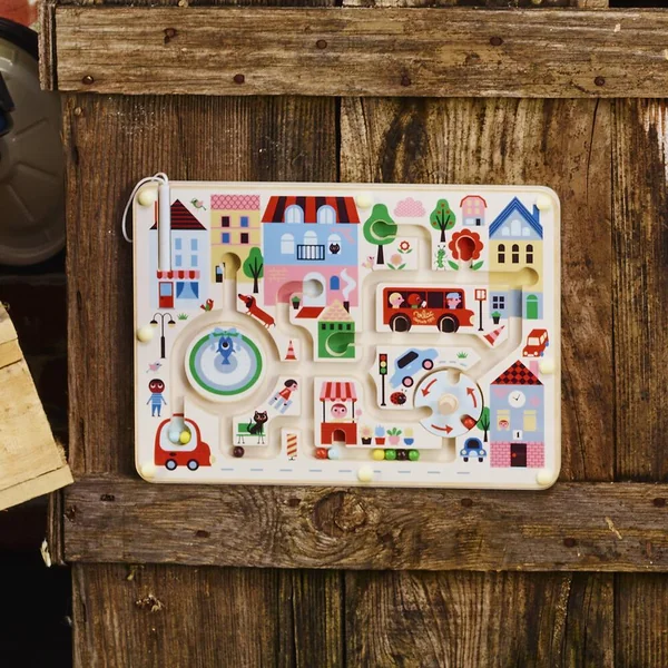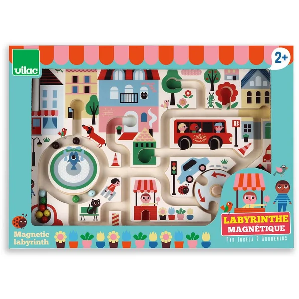Bienvenue dans l’univers poétique et vintage d’Ingela P. Arrhenius. Grâce à un petit stylet magnétique, les enfants font voyager les billes de couleur dans cette magnifique ville. Une bille verte dans un arbre, une rouge dans la fleur, deux autres dans les roues du bus, arriverez-vous à toutes les placer ? C’est encore plus rigolo en passant par le rond-point qu’il faut actionner ! Un jeu en bois ludique qui facilite l’acquisition de la motricité fine des petits, leur permet de se repérer dans l’espace et enrichi leur vocabulaire en nommant les couleurs, les animaux et objets.