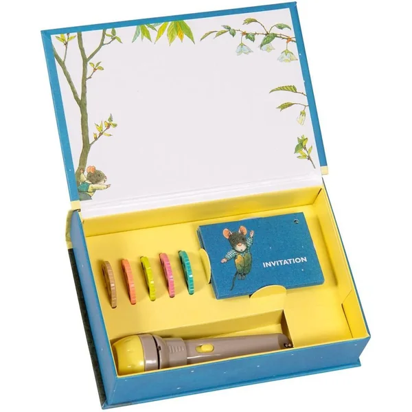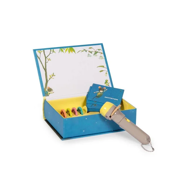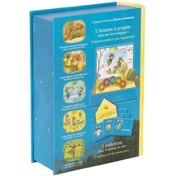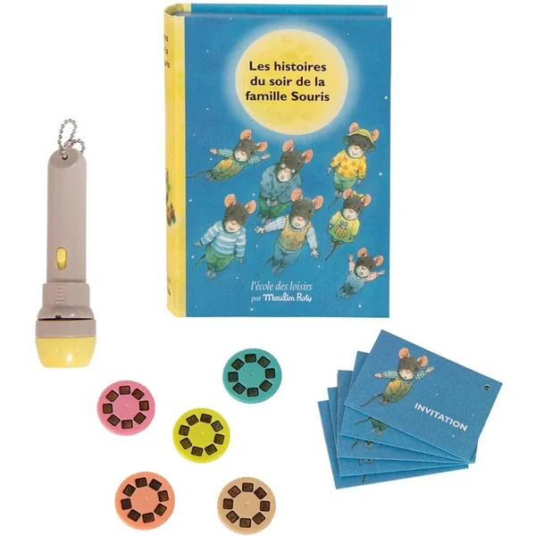 Ravissant coffret aimanté, joliment illustré, conçu comme un livre comprenant : une lampe à projeter, 5 disques et 5 invitations. Chaque disque, projeté sur le mur, raconte une histoire sur la famille Souris, classique de l’école des loisirs.