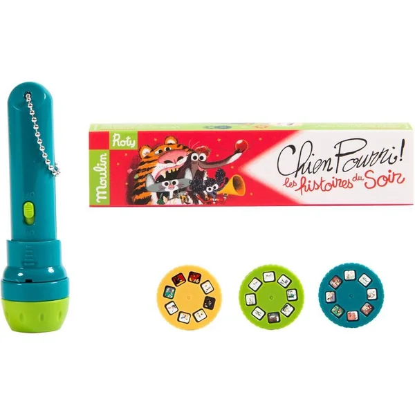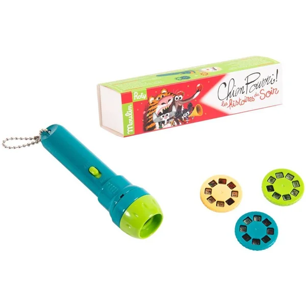 Lampe torche de poche où chacun des 3 disques projetés sur le mur raconte les aventures délirantes de Chien pourri, héros farceur de l’école des loisirs. Les illustrations colorées embarquent l’enfant dans un monde imaginaireoù il y a tout à inventer !
