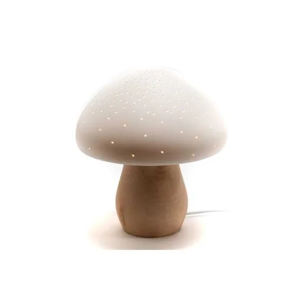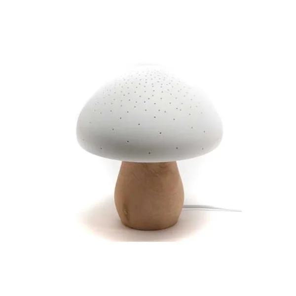 Découvrez la lampe champignon en porcelaine de Amadeus Les Petits, une douce veilleuse ajourée avec un pied en bois pour décorer la chambre et apaiser les nuits de bébé en diffusant une douce lumière. Sa lumière douce et réconfortante apportera une touche cosy et une originalité singulière.