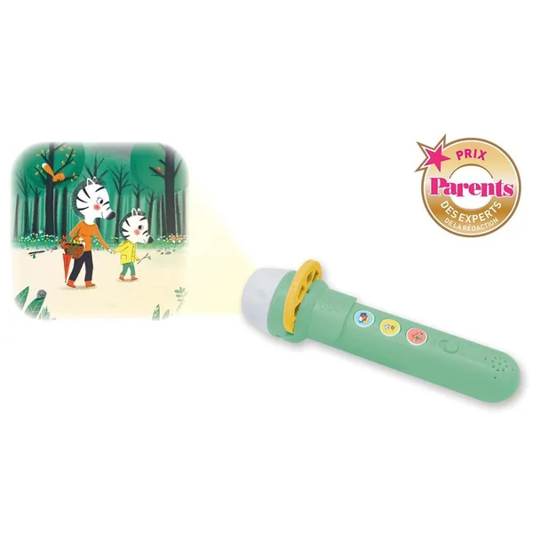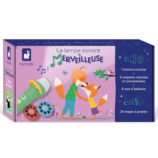 La durée sonore totale est de 491 secondes. La boîte contient une lampe, 3 rondelles qui correspondent chacune aux 3 boutons de la lampe et contenant 8 images, ainsi qu’un pochon de rangement en coton. La lampe fonctionne grâce à 2 piles AAA, non incluses. Cette lampe peut être utilisée en autonomie ou accompagnée d’un parent au moment du coucher.