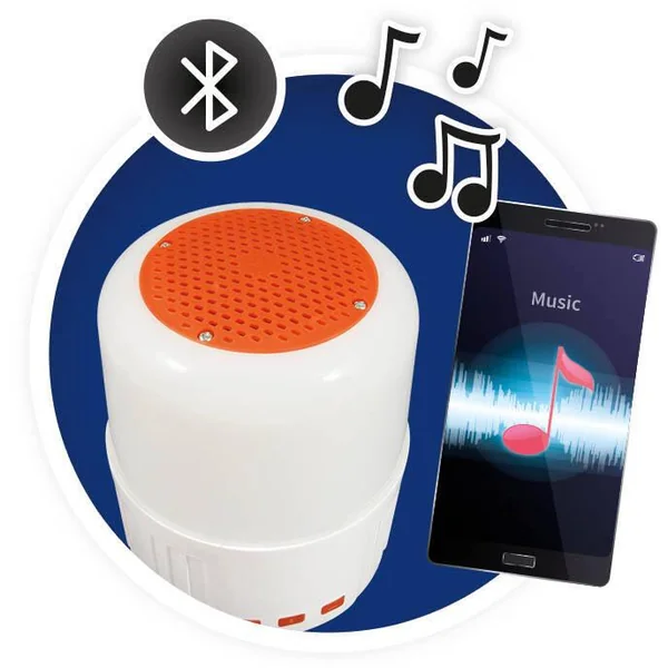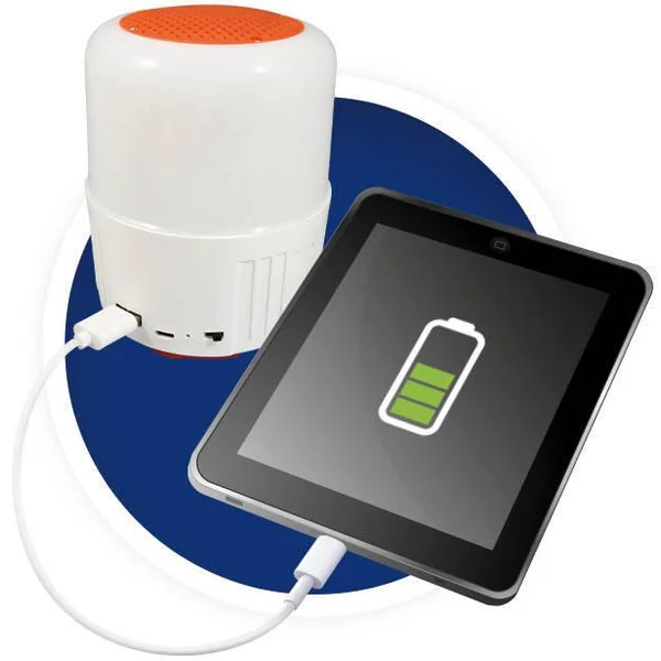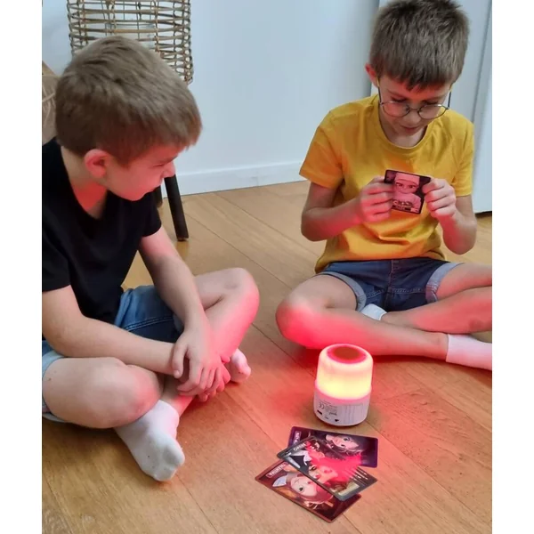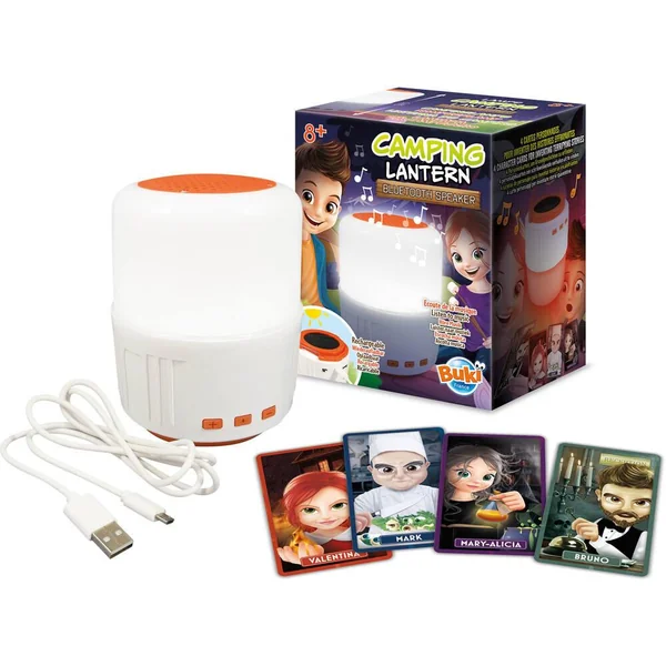 Une lampe de camping rechargeable avec une fonction enceinte Bluetooth. Elle se recharge grâce à son panneau solaire ou avec un câble USB. 3 modes d’éclairage. La lampe est également une batterie externe et peut recharger d’autres appareils électriques. Connecte un téléphone ou une tablette en bluetooth pour diffuser de la musique sur l’enceinte. Mode lumière rouge pour se raconter des histoires qui font peur. Quatre fiches avec des portraits de personnages effrayants inclus. Fonctionne avec une batterie lithium et un câble USB inclus. Cartes illustrées en couleurs.