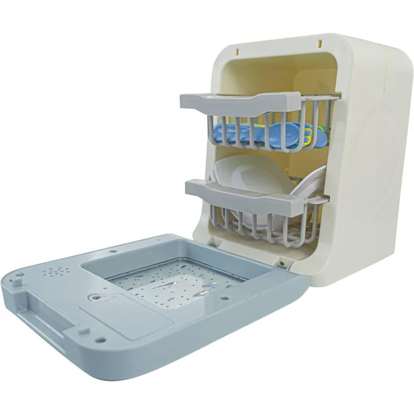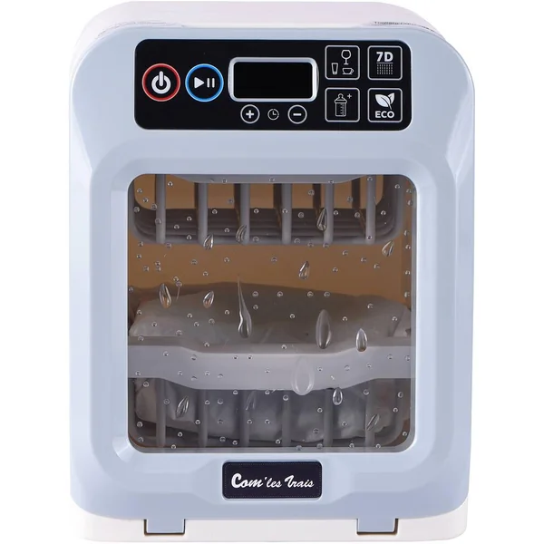 Lave-vaisselle avec accessoires. Effets sonores et lumineux. Boutons : 4 différents programmes de lavage, boutons pour ajuster le temps. La porte s’ouvre et les paniers sont amovibles pour récupérer la vaisselle. Inclus : 3 assiettes (dim. 9 x 9 x 0.7 cm), 3 fourchettes, 3 couteaux et 3 cuillères. 2 piles LR03 fournies. Fonction Try Me. En plastique.