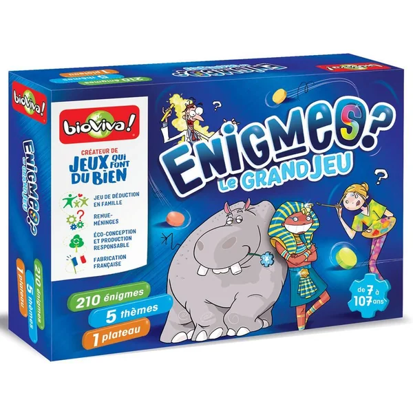 Connaissances, rapidité, adresse. Trouvez les réponses aux énigmes pour propulser vos jetons sur la piste. Augmentez votre score, feintez vos adversaires… mais prenez garde aux pièges. Partez à la découverte du Monde, de la Nature, des Sciences, de l’Histoire et des Arts au travers d’indices drôles et percutants dans un jeu plein de rebondissements, pour toute la famille ! De 7 à 107 ans. De 2 à 8 joueurs. Durée : 30 minutes. Contenu : 1 plateau de jeu, 20 palets de couleurs en bois, 3 plots en bois brut, 126 cartes (210 Énigmes, 210 mots Super Enigme), 1 cache carte et 1 règle du jeu. Compatibles avec les jeux de cartes Enigmes ! (vendus séparément)-