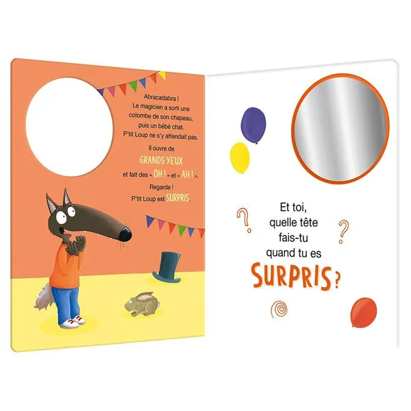 Aujourd’hui, P’tit Loup est de bonne humeur. Et toi, quelle tête fais-tu quand tu es heureux ? Découvre les 6 grandes émotions et amuse-toi à les imiter dans un joli miroir présent à chaque page !