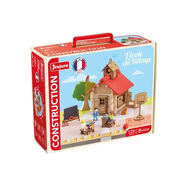 L’Ecole du Village 125 pièces : Jeu de construction en bois brut et teinté avec une notice de montage, un tapis de jeu et de nombreux accessoires.