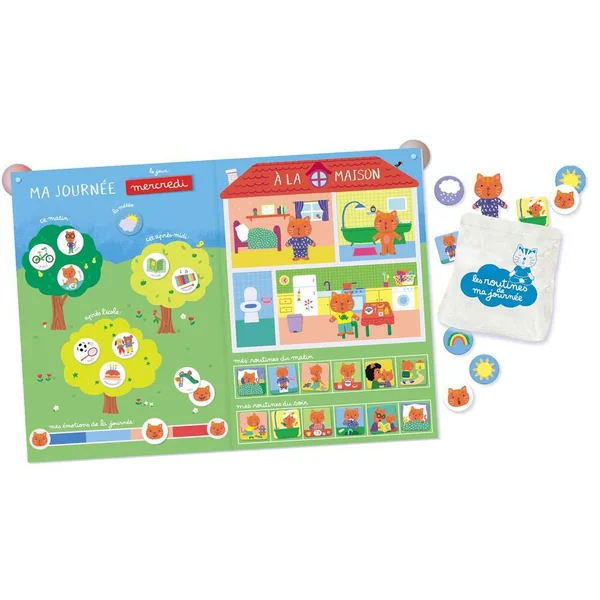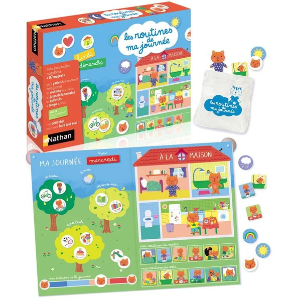 Un premier calendrier magnétique, idéal pour la maternelle. Chaque jour, l’enfant pose sur son tableau les magnets des routines et des activités. Il apprend à se repérer dans la semaine et à observer le temps qu’il fait. Et chaque soir, il place un magnet sur le thermomètre des émotions. Un moment privilégié d’échange à partager avec votre enfant. Petit à petit, il devient autonome et apprend à exprimer ses émotions.