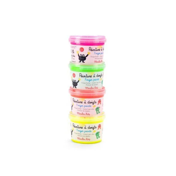 4 pots de peinture à doigts fluo pour laisser libre court à la créativité des petits ! Plongez le doigt dans la peinture, déposez la couleur sur une feuille et commencez à créer votre oeuvre. Gouache lavable à l’eau. Testé dermatologiquement. 2 ans et +