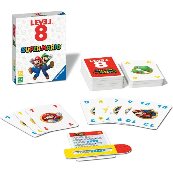 Partez à l’aventure Super Mario dans une version Nintendo de votre jeu de combinaisons préféré ! Soyez le plus rapide à réunir les combinaisons demandées pour monter de niveau : suites, cartes de même valeur ou couleur ? Vous pouvez aussi être le premier à vous débarrasser de vos cartes pour gagner des niveaux supplémentaires. Mais attention, plus vous montez et plus les combinaisons deviennent difficiles. Pour 2 à 6 joueurs. Durée d’une partie 45 minutes. Contenu : 120 cartes – 1 règle du jeu.