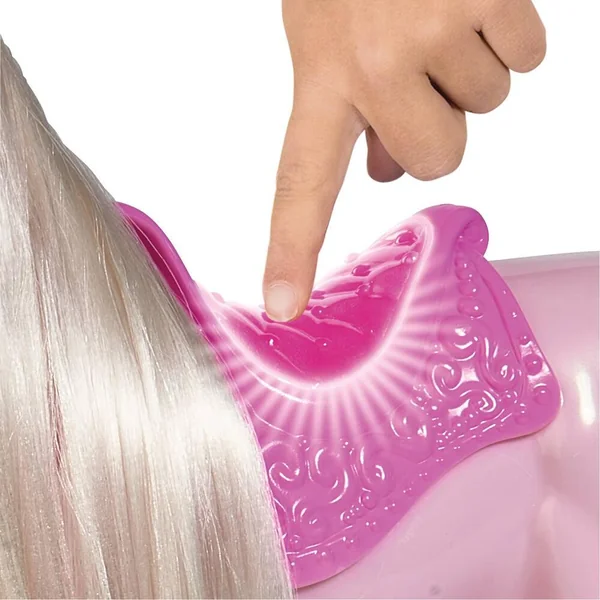 Plonge dans l’univers de la féérie avec ta licorne lumineuse ! Elle convient parfaitement aux poupées mannequins de 29 cm (non fournies). Presse le dos de la licorne : sa corne et sa selle s’illuminent ! Tu pourras prendre soin de ton animal en brossant sa crinière et en la décorant. 1 brosse et 6 barrettes sont incluses.