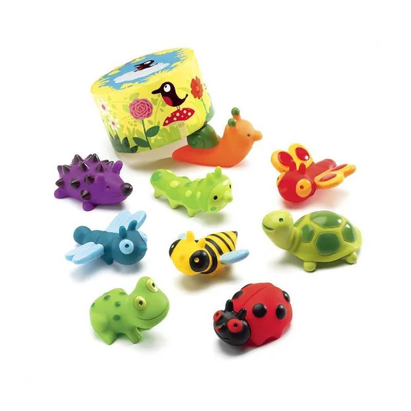 • 9 beaux animaux en caoutchouc (papillon, coccinelle, abeille, escargot, hérisson, grenouille, tortue, libellule, chenille – L 7 cm)