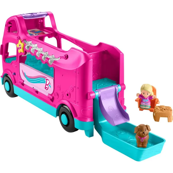 Camping car trilingue sons et lumières avec 2 boutons d’activation. 2 figurines, 3 accessoires. Piscine, toboggan, comptoir et portes à ouvrir. ; Fournies x AA – LR6 x 3 .