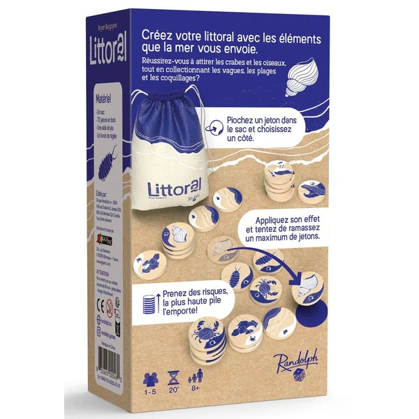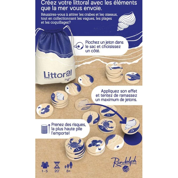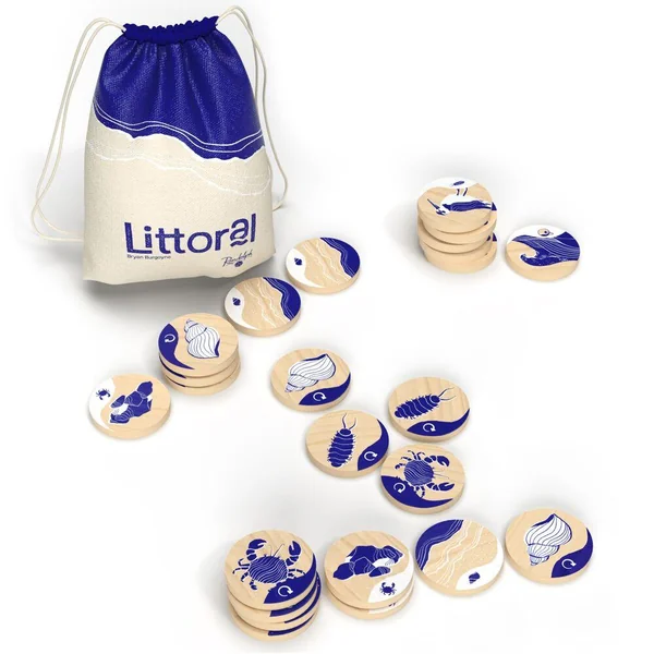 Littoral est le premier jeu dans la toute nouvelle collection Pick-a-Side. Les jeux dans cette collection contiennent uniquement des jetons en bois, sont légers et portatifs pouvant être joués n’importe où. Amenez les lors de votre prochaine aventure!