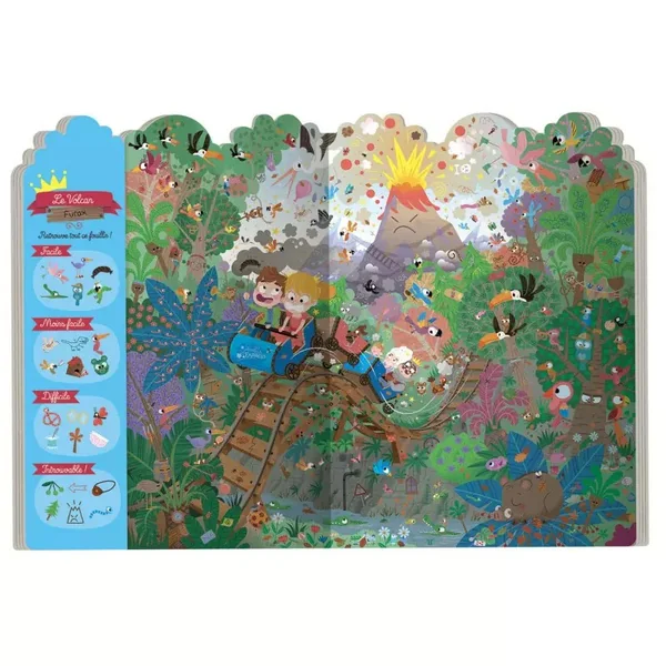 Un cherche et trouve, avec 26 éléments à retrouver par ordre de difficulté dans chaque lieu du royaume Dufouillis : le village de Cafouillis-les-oies, le Volcan Furax, la Grand Flaque d’Eau, la Forêt en Chantier, le Port Nawak, le Champ du Moulin Pourri. Ce livre-jeu favorise l’attention, l’observation et la concentration de l’enfant.
