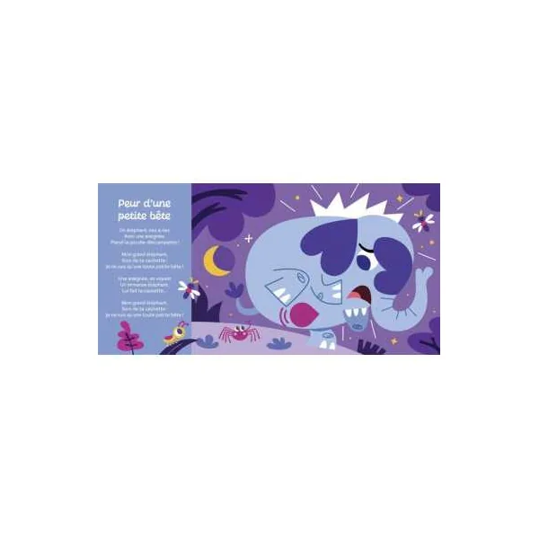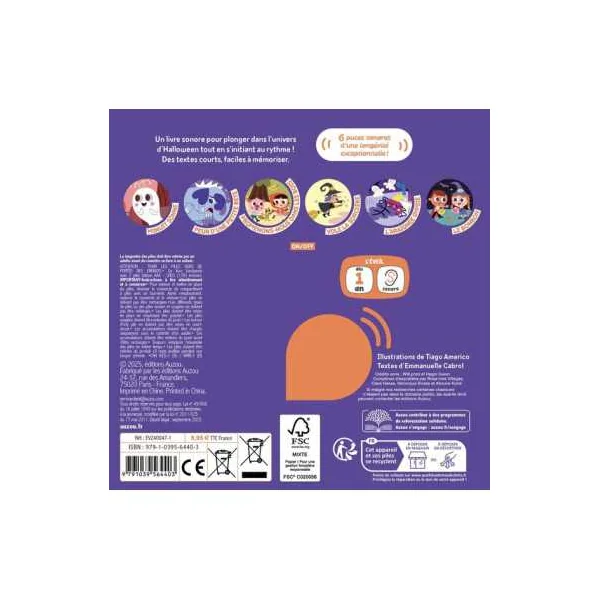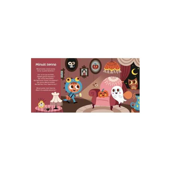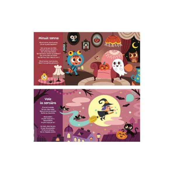 Un livre sonore pour plonger dans l’univers d’Halloween à travers des comptines connues et inventées : Minuit sonne, Peur d’une petite bête, Promenons-nous dans les bois, Vole la sorcière, L’araignée gypse, Le bonbon.