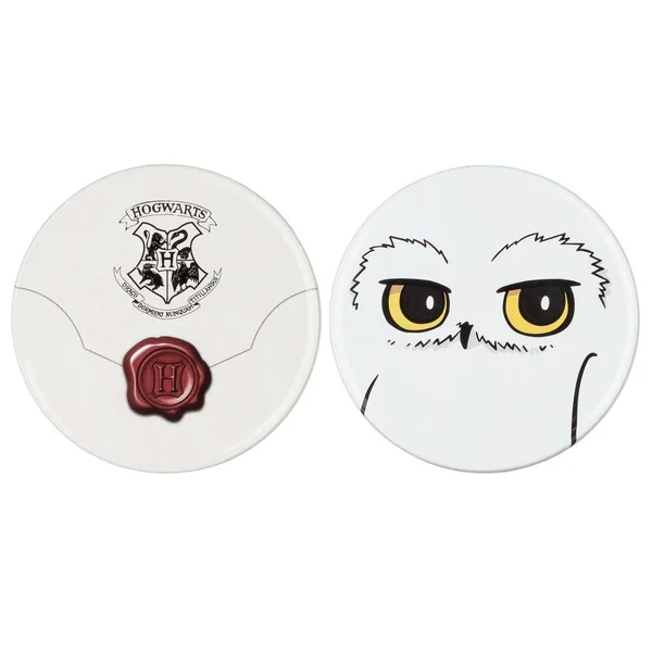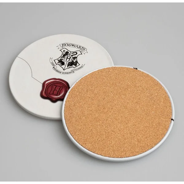 Lot de deux sous-verres avec base en liège et surface en étain avec motif imprimé. Dimensions : 9 x 9 cm.