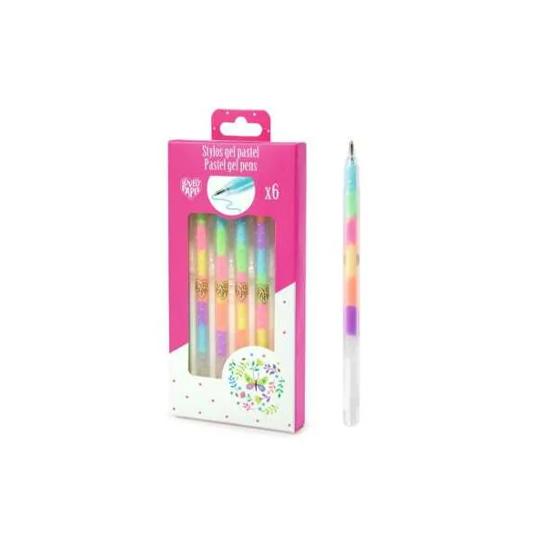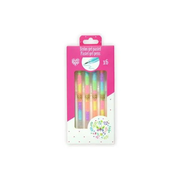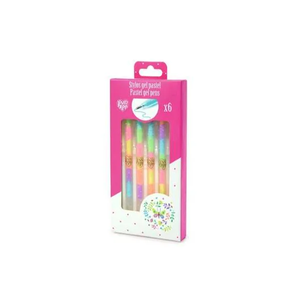 Découvrez les 6 stylos gel pastel de Lovely Paper by Djeco, un étui de 6 stylos gel aux couleurs de l’arc-en-ciel. Chaque stylo comporte 6 couleurs qui changent au fur et à mesure de son utilisation. Un format idéal à glisser dans un sac à main, dans un sac à dos pour partir en week-end et donner de la lumière à vos écrits.