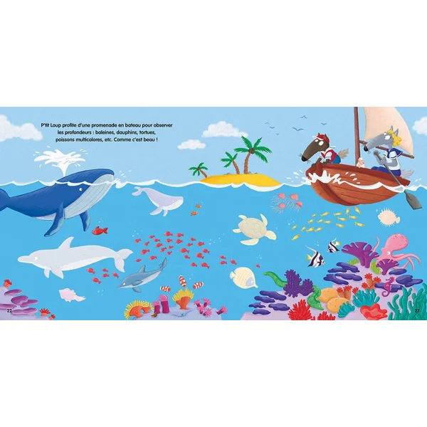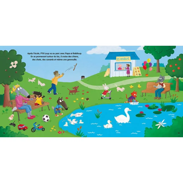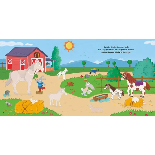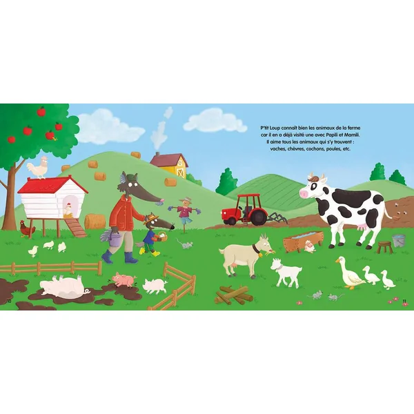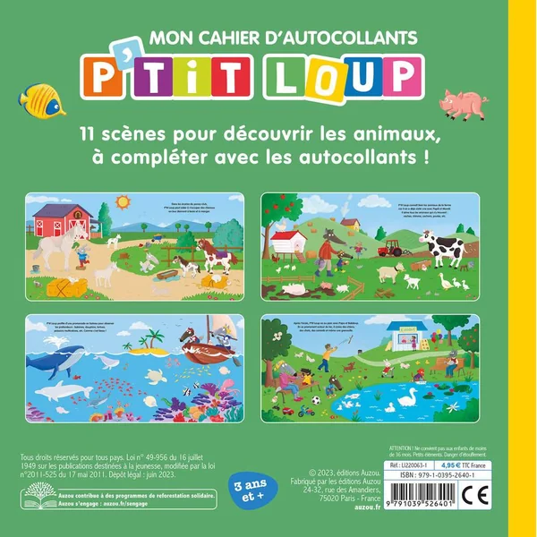 À travers 11 décors détaillés, le lecteur suit P’tit Loup à la rencontre d’animaux extraordinaires et du quotidien. Sur chaque page, des espaces identifiés indiquent l’endroit où l’enfant doit placer ses stickers.