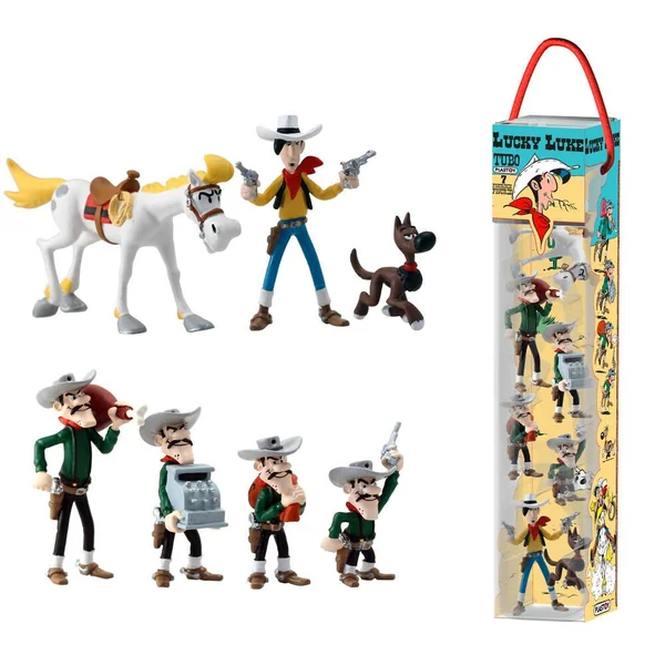 Les Dalton se sont encore échappés du pénitencier ! Comme à leur habitude, ces bandits profitent de leur cavale pour semer la terreur au Far West… mais pas pour longtemps, car Lucky Luke est sur leurs traces ! Accompagné de Jolly Jumper et du fidèle Rantanplan, le cow boy ne tardera pas à les remettre en prison… Retrouvez tous l’univers de Lucky Luke grâce à ce tubo de sept figurines !