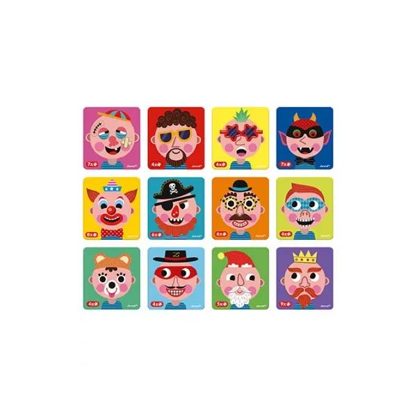 Le jeu se compose de 12 cartes illustrées avec des visages de garçon et 70 magnets.
