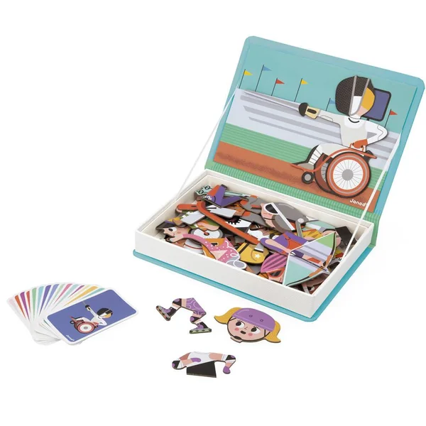 Vive le sport ! Avec ce joli jouet magnétique coloré, votre enfant découvrira 16 sports, avec la possibilité d’en imaginer plein d’autres ! Il est composé d’un support magnétique, de 48 magnets et de 16 cartes représentant des sports connus. Les plus petits comme les plus grands s’amuseront à reproduire les modèles et à les mélanger pour imaginer des mix de sports tous plus farfelus les uns que les autres. Jouet magnétique en carton FSC™ pour les enfants –