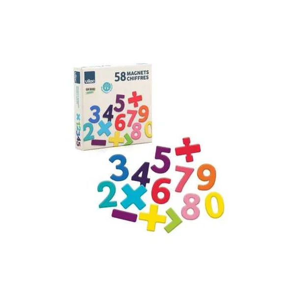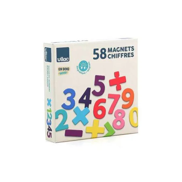 Découvrez les Magnets chiffres bois 58 pièces de Vilac, un coffret éducatif avec des chiffres en bois magnétiques pour les enfants à partir de 3 ans.