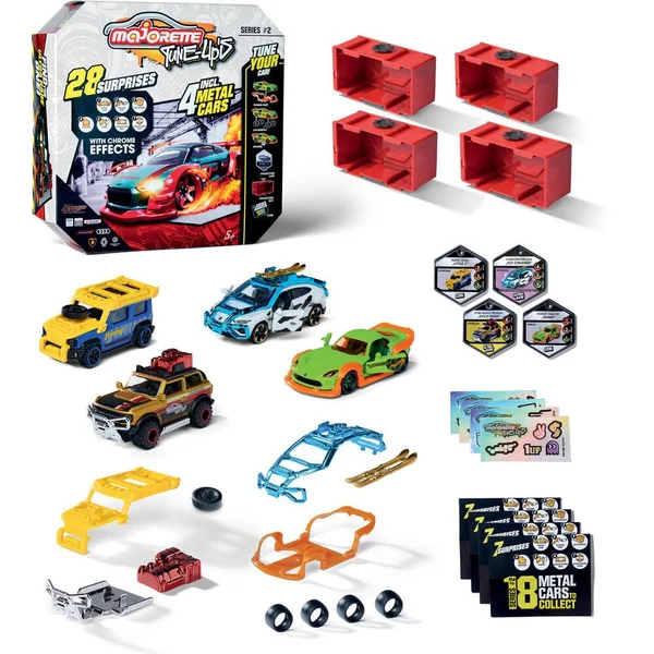 La collection Tune-Up’s est dédiée au tuning des véhicules Majorette. Ce set se compose de 4 coffrets Tune-Up’s série 2, version Chrome. Chaque coffret se compose de 7 surprises : 1 véhicule en métal échelle 1/64ème avec suspensions et parties ouvrantes – des accessoires des stickers – des pièces de tuning – 1 badge collector rassemblant les performances du véhicule – 1 flyer de collection – 1 boîte de rangement.