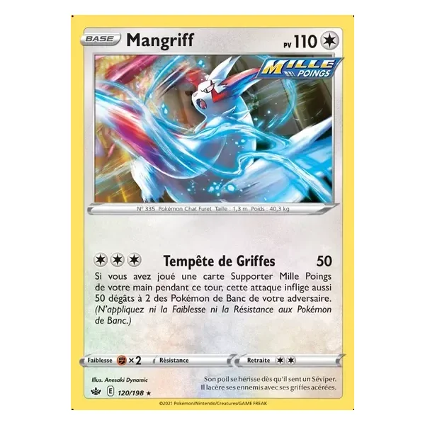 Découvrez Mangriff (cre120), une carte Pokémon de l’extension Règne de Glace, provenant du bloc Épée & Bouclier. Idéale pour compléter votre collection, cette carte Rare plaira autant aux collectionneurs qu’aux joueurs.