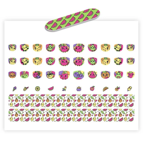 Enfin une manucure adaptée aux petits : express, facile à poser et à retirer ! Du plus petit autocollant pour l’auriculaire au plus gros, pour le pouce, collez, appuyez : c’est fait ! Pas de vernis qui s’écaille, juste le plaisir de décorer ses ongles avec de jolies illustrations ! Et pour varier les motifs ou créer un autocollant sur mesure : coupez un morceau de la bande autocollante correspondant à la largeur de l’ongle souhaité.