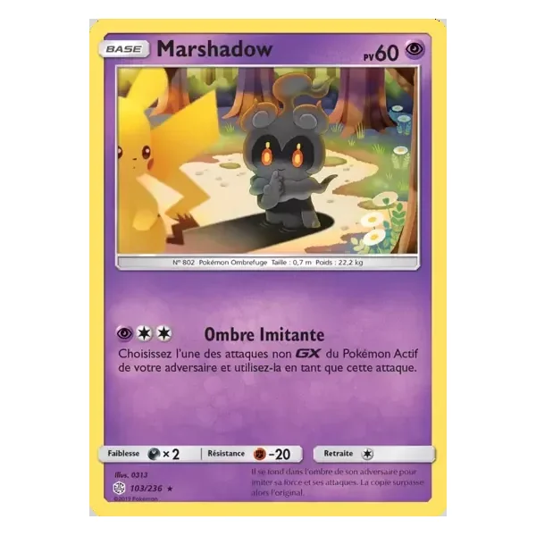 Découvrez Marshadow (cec103), une carte Pokémon de l’extension Éclipse Cosmique, provenant du bloc Soleil & Lune. Idéale pour compléter votre collection, cette carte Rare plaira autant aux collectionneurs qu’aux joueurs.