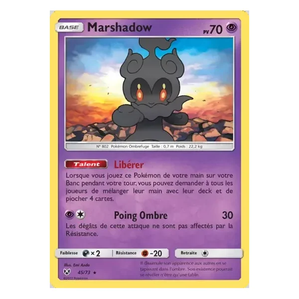 Découvrez Marshadow (slg045), une carte Pokémon de l’extension Légendes Brillantes, provenant du bloc Soleil & Lune. Idéale pour compléter votre collection, cette carte Holo Rare plaira autant aux collectionneurs qu’aux joueurs.