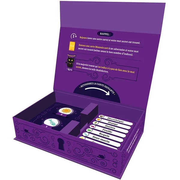 - Un joueur ouvre discrètement la boite et découvre un mot à faire deviner avec un nombre précis d’indices.