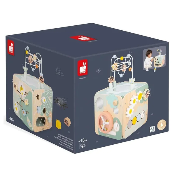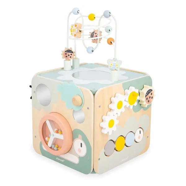 C’est un jouet d’éveil complet et pensé pour stimuler les sens des tout-petits. Au programme de ce jouet premier âge en bois : motricité fine, éveil sonore, manipulation et encastrement, et une nouvelle amie surprenante … Avec ses 11 activités réparties sur chaque face, ce grand cube multi-activités regorge de surprises, toutes à portée de main de bébé ! Sont à sa disposition : des engrenages fleurs à faire tourner, 1 coccinelle qui fait « cric-cric », 1 chenille multicolore dont chaque anneau tourne autour d’un axe, 2 miroirs (dont 1 caché sous 1 feuille en feutrine), 1 escargot dont la coquille tourne pour faire bouger des perles à l’intérieur, 1 labyrinthe avec 6 pièces en bois à faire coulisser, 1 boite à forme avec 5 pièces à encastrer, ainsi que 1 grand boulier et 1 grand miroir en forme de fleur pour se regarder sur le dessus.