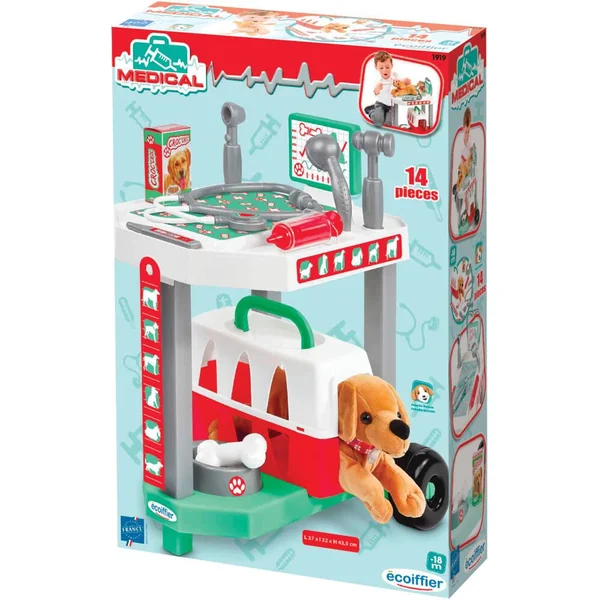 Une table d’examen roulante pour ce joli chien en peluche (inclus) avec valisette de transport, écuelle, os et tous les accessoires du vétérinaire. 14 pièces.