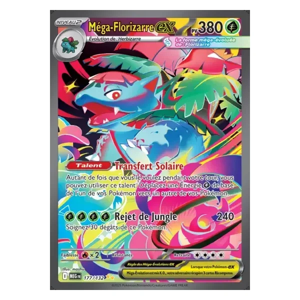 Découvrez Mega Florizarre (meg177), une carte Pokémon de l’extension Mega Evolution, provenant du bloc Méga-Évolution. Idéale pour compléter votre collection, cette carte Alternative plaira autant aux collectionneurs qu’aux joueurs.