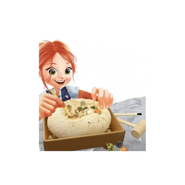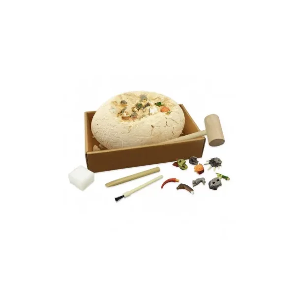Le coffret comprend un oeuf en plâtre, des outils et des fiches découvertes sur les 4 dinosaures.
