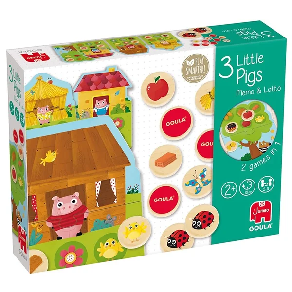 Jeu éducatif préscolaire pour les enfants à partir de 2 ans. Dans ce jeu, avec des illustrations des 3 petits cochons, on retrouve deux manières de jouer : le mémo et le loto.
