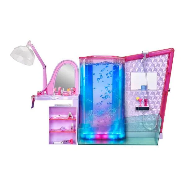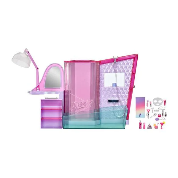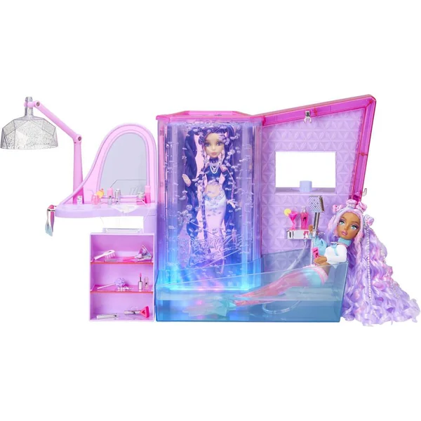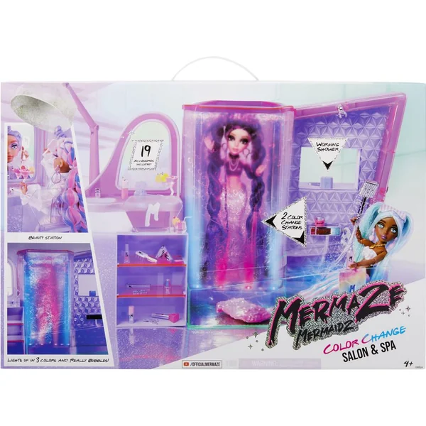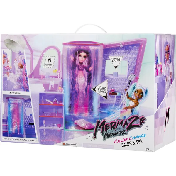Saviez-vous que les sirènes sont comme nous ? Elles adorent s’amuser avec leurs amis dans le salon ! Remplissez la chambre avec de l’eau et regardez les bulles se déplacer dans le mur lumineux alors que votre poupée se détend à l’intérieur et que la couleur de sa queue change ! Ou utilisez la baignoire qui fonctionne pour qu’elle se détende dans l’eau. Lorsque elle aura fini, asseyez-la dans la chaise du salon, devant sa toilette, pour un relooking ! Le sèche-cheveux devient un entonnoir pour remplir le mur à bulles d’eau. Comprend de nombreux accessoires pour une journée de détente comme au spa. Contient 1 salon de beauté, 1 baignoire, 1 poste de coiffure, 1 sèche-cheveux/entonnoir, 2 étagères, 1 pince en C, 1 couvercle de salon de beauté, 19 accessoires.