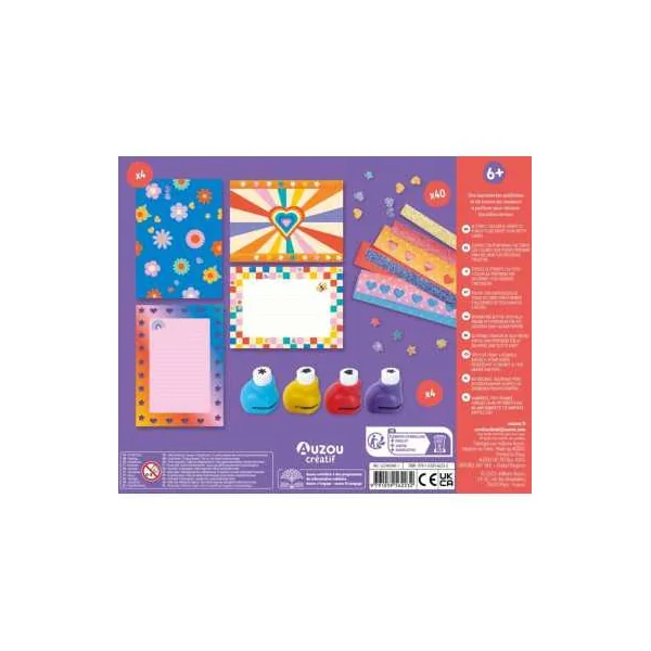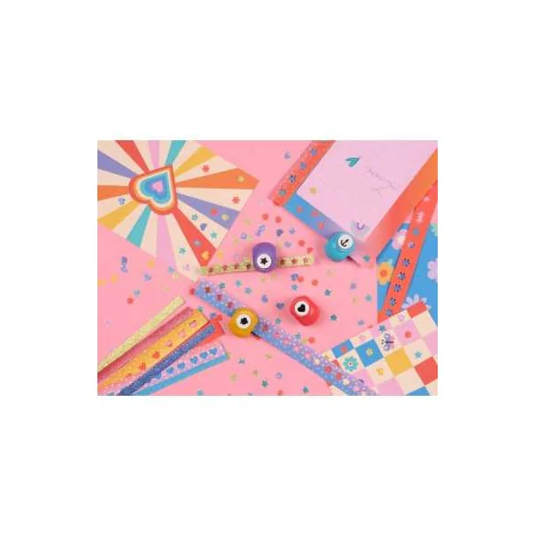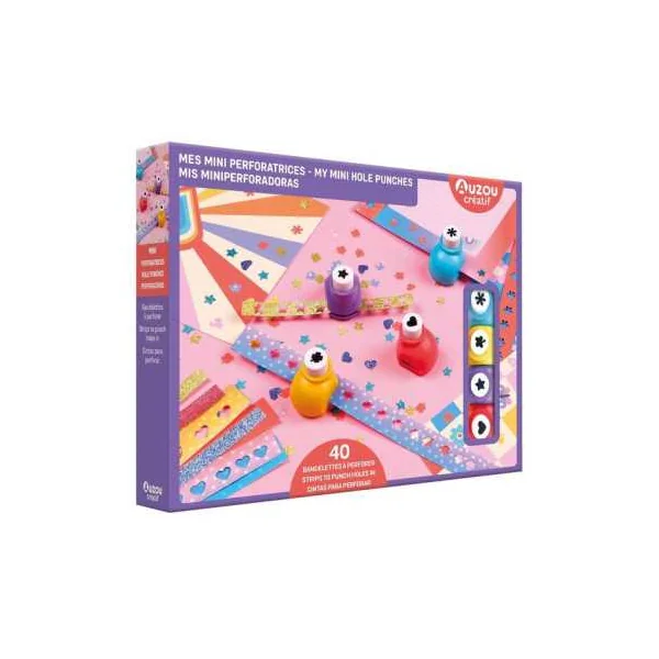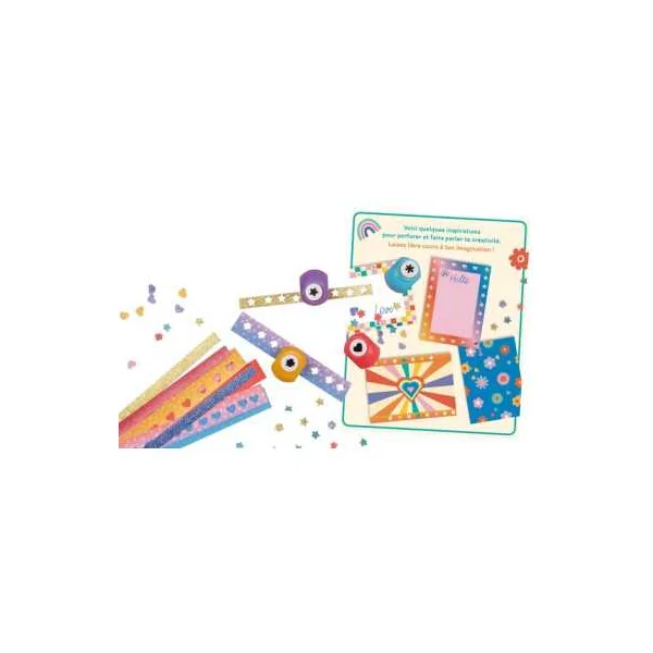 Le coffret contient 40 papiers de couleurs et pailletés à perforer, ainsi que 4 mini perforatrices fantaisie.