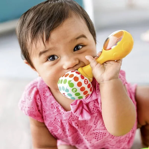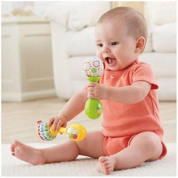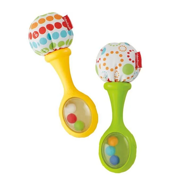 Deux petites maracas adaptées aux mains de bébé. Les perles colorées divertissent bébé et font du bruit. Leur manche en tissu et texture molle apporte de la douceur.