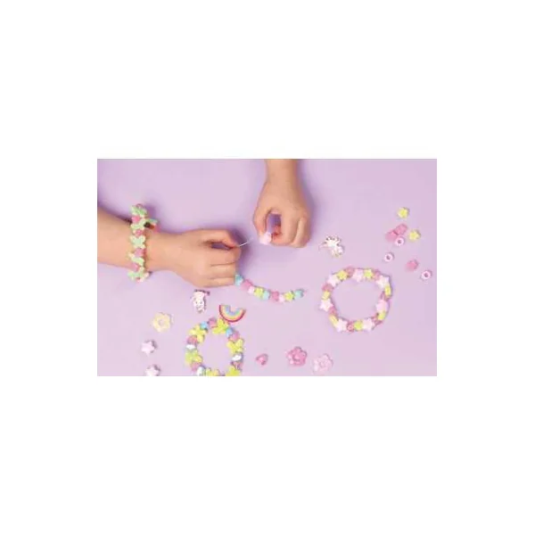 Le coffret contient plus de 230 perles en plastique, 3 breloques fantaisie et du fil élastique.